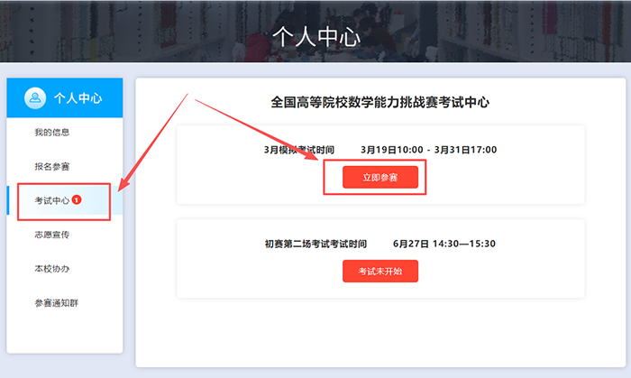 第二步:登录官网后在个人中心点击【考试中心】菜单,点击【立即参赛】按钮参加模拟考试。